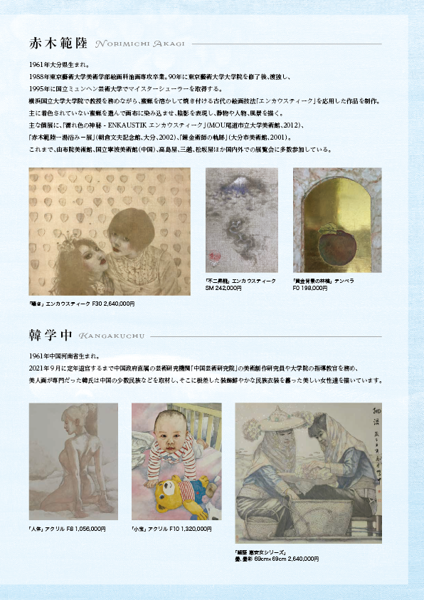 中国で知名度の高い韓学中氏と、中国各省との文化交流、また中国の美術館での展示歴を持つ横浜国立大学教授・赤木範陸氏による、日中両国の文化交流を象徴する展覧会です。お二人は同い年で、異なる地域―中国と日本―で活動を続けながら、「自然や生命への讃歌」という共通のテーマに取り組んでいます。技法は異なりますが、韓氏は長年にわたり、中国の少数民族地域の女性や家族・労働者といった素朴な人々の姿を描き続けており、中国の芸術を牽引する画家の一人です。赤木氏は、古代の絵画技法「エンカウスティーク(蝋画)」を応用した独自の技法を確立し、女性像を主題としながらも、幅広い題材に意欲的に取り組んでいます。本展では人物画を中心に、山水画や吉祥画なども併せてご紹介いたします。また、同時開催する張媛媛氏は赤木氏の門下生にあたり、国内外で人気を博している若手作家になります。この機会にご高覧下さいますようご案内申し上げます。